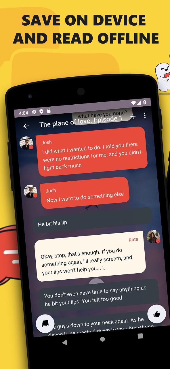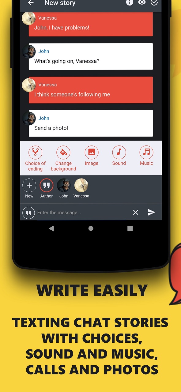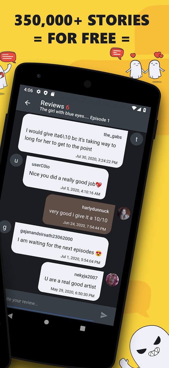 Write your own love stories, mystery stories, horror stories, or whatever you want! After the publication of your story it will be immediately available to everyone via search in the app. You can also share a link to your texting story with your friends or send it to our Facebook community https://www.facebook.com/yourmistoryapp. The BEST STORIES WILL be ADDED to the Mistory's Catalog, where they will be seen by thousands of readers! Authors of stories published in the Catalog are rewarded with in-app coins for each time users view ads when reading their stories!